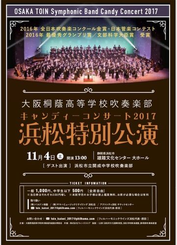 大阪桐蔭高校吹奏楽部が浜松にやって来ます。そのコンサートで開成中が、一緒に演奏させていただくことになりました。興味のある方はぜひ、ご来場ください! 大阪桐蔭高等学校吹奏楽部 キャンディコンサート2017 浜松特別公演 2017・11・4土 13:00- 雄踏文化…