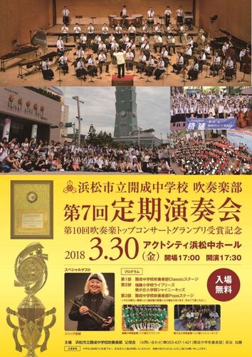 お待たせしました。定期演奏会のお知らせです。 浜松市立開成中学校吹奏楽部第7回定期演奏会 第10回浜松市吹奏楽トップコンサートグランプリ受賞記念 2018.3.30(金)17:00open 17:30〜start アクトシティ浜松中ホール 全席入場無料 今回の特別すぎるゲス…